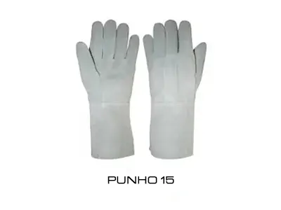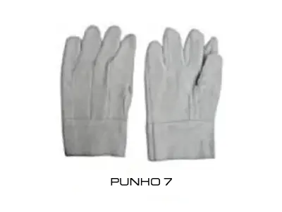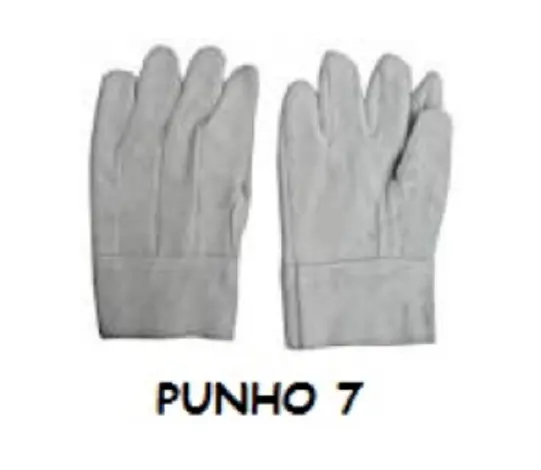 DESCRIÇÃO: confeccionada em raspa, reforço interno na palma e face palmar dos dedos, tira de reforço externo entre os dedos, tira de reforço externo entre os dedos polegar e indicador, punho 7 cm.