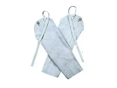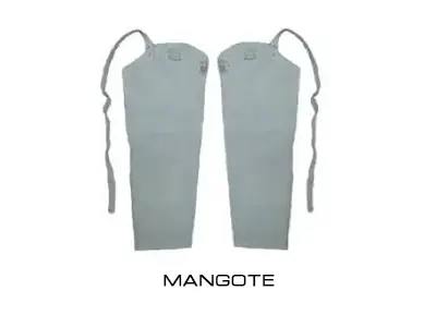 DESCRIÇÃO: Mangote de segurança confeccionado em raspa, tiras presas por meio de arrebites e fivelas metálicas ou velcro para ajustes.
